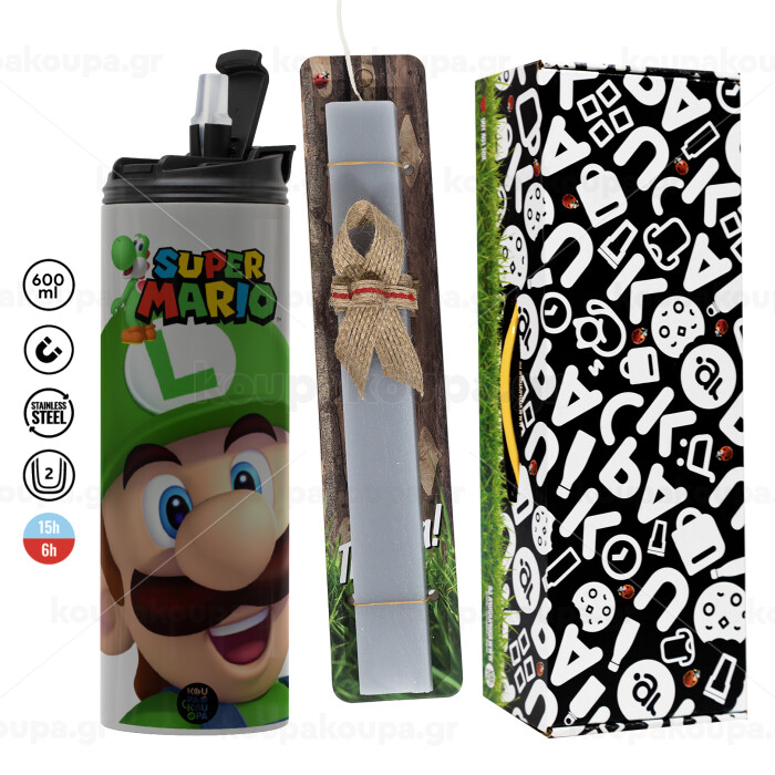 Super mario Luigi, Easter candle with Grey Tumbler Thermo 600ml & aromatic flat candle (30cm) (GREY)