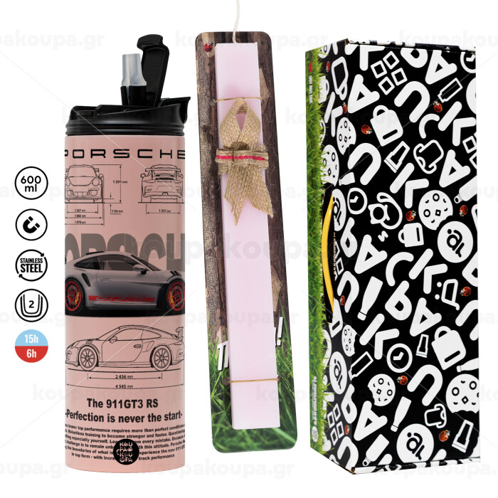 Porsche, Easter candle,Travel Tumbler 2 Lids, with metal straw & cleaning brush & aromatic flat candle (30cm) (PINK)