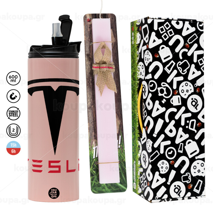 Tesla motors, Easter candle,Travel Tumbler 2 Lids, with metal straw & cleaning brush & aromatic flat candle (30cm) (PINK)