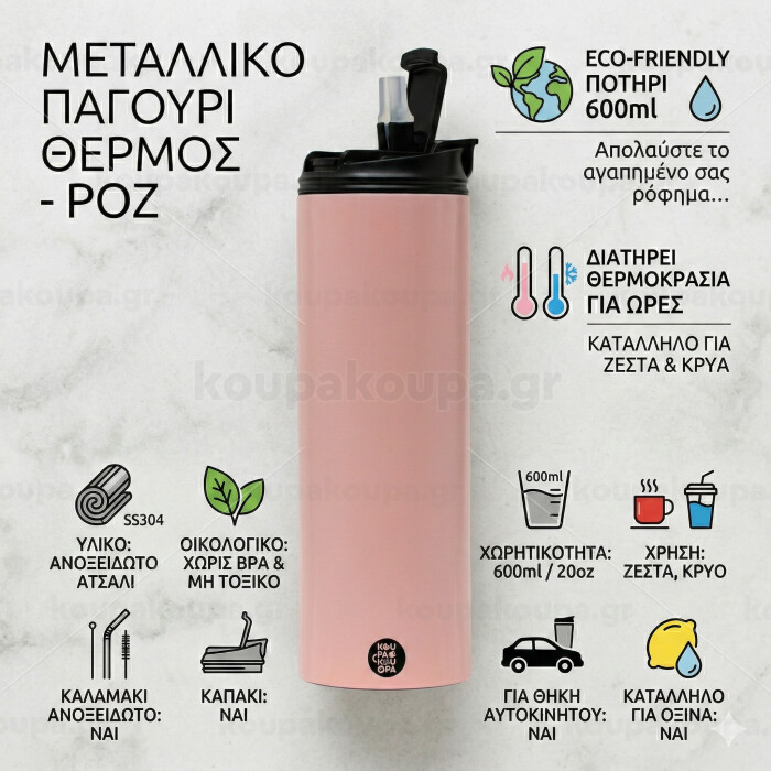 Eco friendly 600ml thermal cup with a metallic reusable straw. Enjoy your favorite beverage at any moment in this unique eco-friendly thermos. It maintains the temperature for several hours and is made from stainless steel. Suitable for both hot and cold beverages. It comes with a cleaning brush for the straw.
