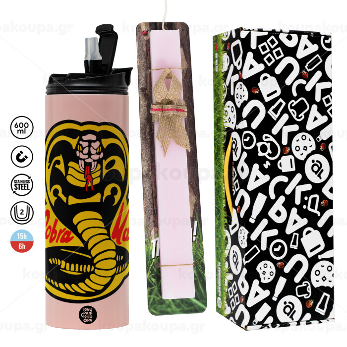 Cobra Kai Yellow, Easter candle,Travel Tumbler 2 Lids, with metal straw & cleaning brush & aromatic flat candle (30cm) (PINK)