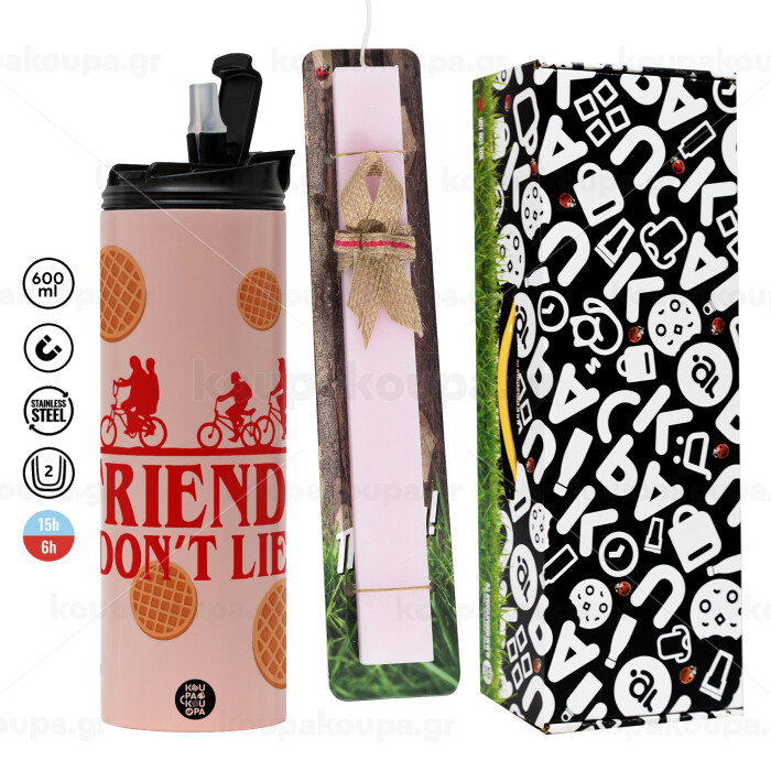 Friends Don't Lie, Stranger Things, Easter candle,Travel Tumbler 2 Lids, with metal straw & cleaning brush & aromatic flat candle (30cm) (PINK)