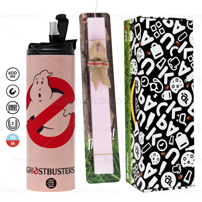 Ghostbusters, Easter candle,Travel Tumbler 2 Lids, with metal straw & cleaning brush & aromatic flat candle (30cm) (PINK)