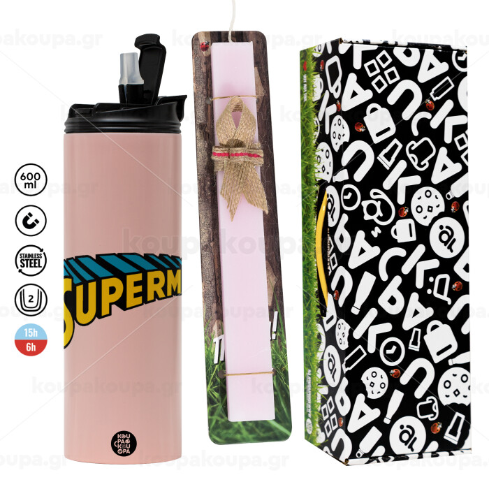 Superman vintage, Easter candle,Travel Tumbler 2 Lids, with metal straw & cleaning brush & aromatic flat candle (30cm) (PINK)