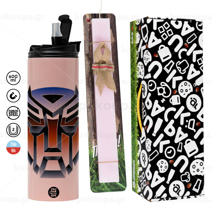 Transformers, Easter candle,Travel Tumbler 2 Lids, with metal straw & cleaning brush & aromatic flat candle (30cm) (PINK)