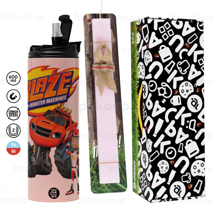 Ο Μπλέιζ και οι Φίλοι του, Easter candle,Travel Tumbler 2 Lids, with metal straw & cleaning brush & aromatic flat candle (30cm) (PINK)