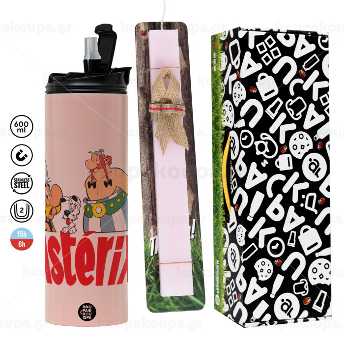 Asterix and Obelix, Easter candle, Travel Tumbler 600ml Double Wall & aromatic flat candle (30cm) (PINK)