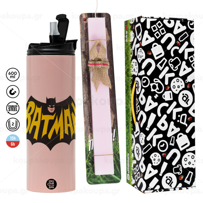 Batman classic logo, Easter candle,Travel Tumbler 2 Lids, with metal straw & cleaning brush & aromatic flat candle (30cm) (PINK)