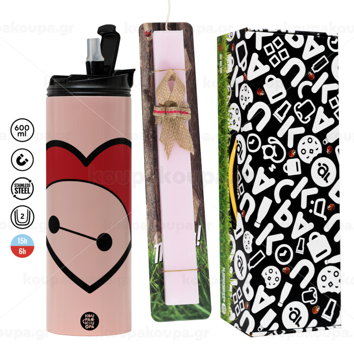 Baymax heart, Easter candle, Travel Tumbler 600ml Double Wall & aromatic flat candle (30cm) (PINK)