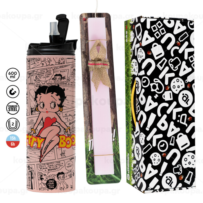 Betty Boop, Easter candle,Travel Tumbler 2 Lids, with metal straw & cleaning brush & aromatic flat candle (30cm) (PINK)