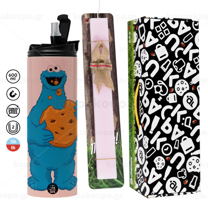 Cookie Monster, Easter candle, Travel Tumbler 600ml Double Wall & aromatic flat candle (30cm) (PINK)