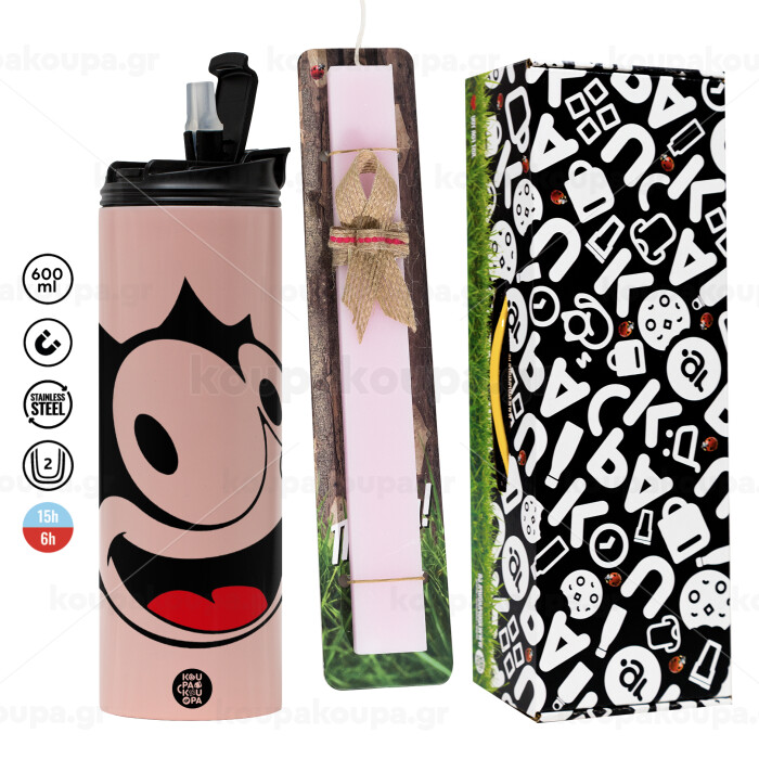 Felix the cat, Easter candle, Travel Tumbler 600ml Double Wall & aromatic flat candle (30cm) (PINK)