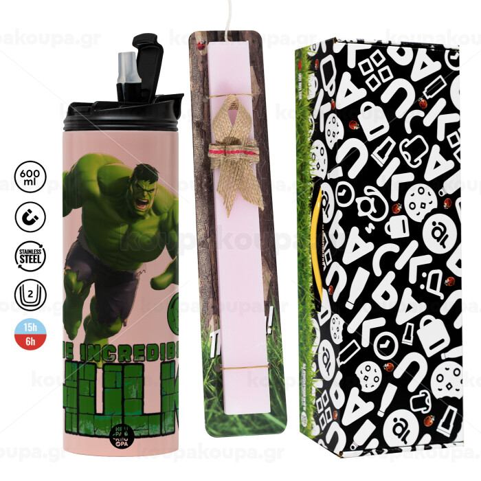 Hulk, Easter candle, Travel Tumbler 600ml Double Wall & aromatic flat candle (30cm) (PINK)