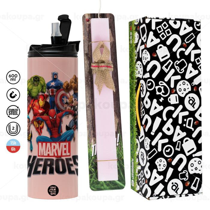 MARVEL heroes, Easter candle, Travel Tumbler 600ml Double Wall & aromatic flat candle (30cm) (PINK)