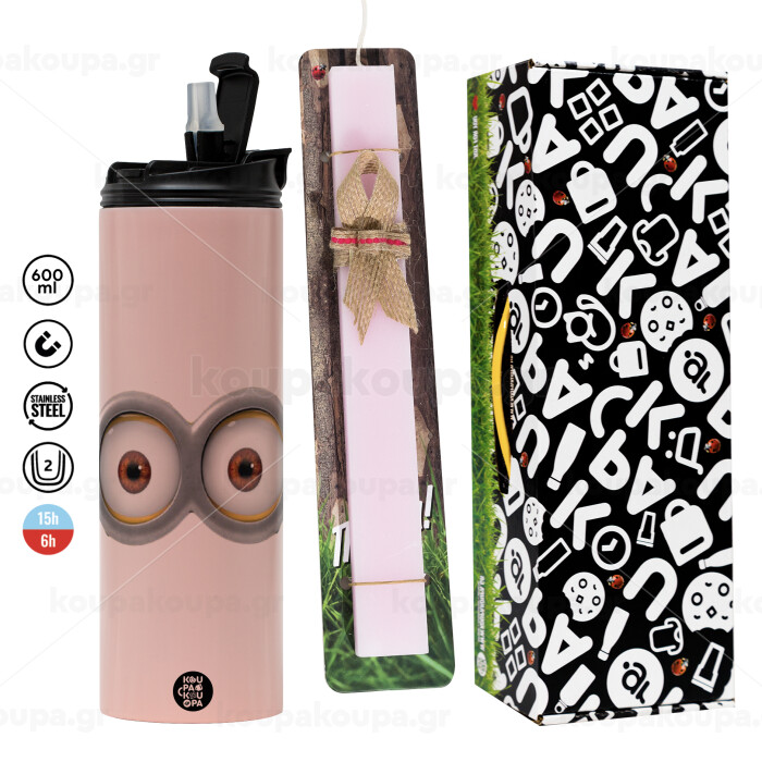 Minions, Easter candle,Travel Tumbler 2 Lids, with metal straw & cleaning brush & aromatic flat candle (30cm) (PINK)