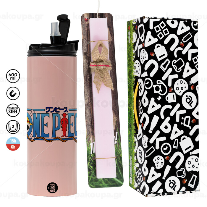 Onepiece logo, Easter candle, Travel Tumbler 600ml Double Wall & aromatic flat candle (30cm) (PINK)