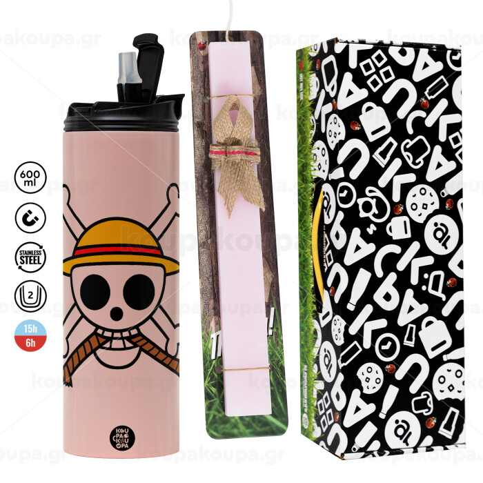 Onepiece skull, Easter candle, Travel Tumbler 600ml Double Wall & aromatic flat candle (30cm) (PINK)