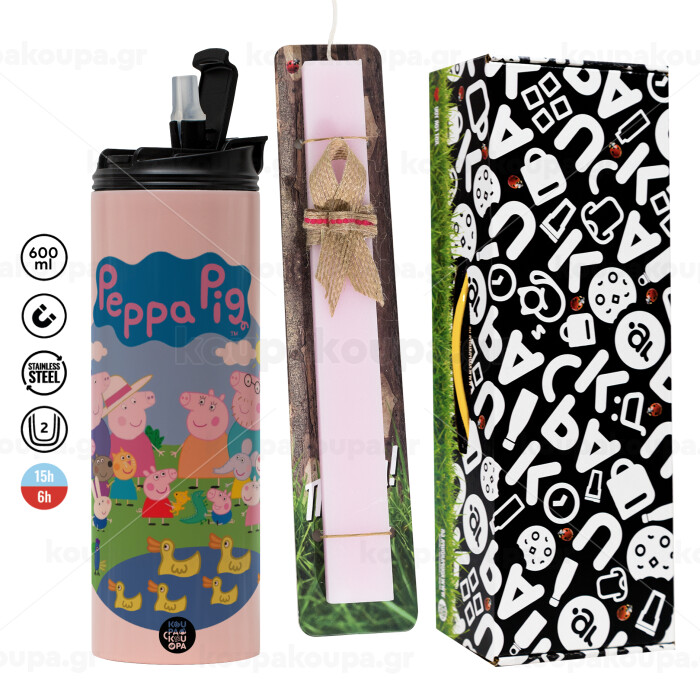 Peppa pig Family, Easter candle, Travel Tumbler 600ml Double Wall & aromatic flat candle (30cm) (PINK)