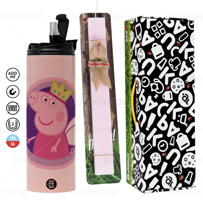 Peppa pig Queen, Easter candle, Travel Tumbler 600ml Double Wall & aromatic flat candle (30cm) (PINK)