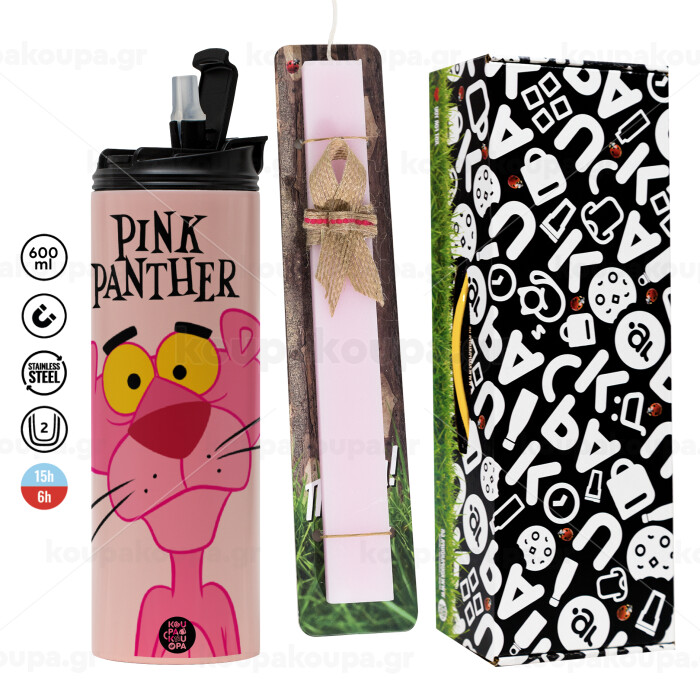 Pink Panther cartoon, Easter candle, Travel Tumbler 600ml Double Wall & aromatic flat candle (30cm) (PINK)