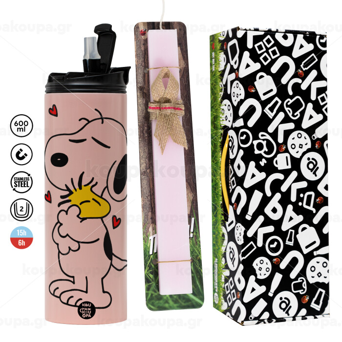 Snoopy Love, Easter candle, Travel Tumbler 600ml Double Wall & aromatic flat candle (30cm) (PINK)