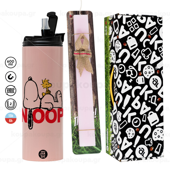 Snoopy sleep, Easter candle, Travel Tumbler 600ml Double Wall & aromatic flat candle (30cm) (PINK)