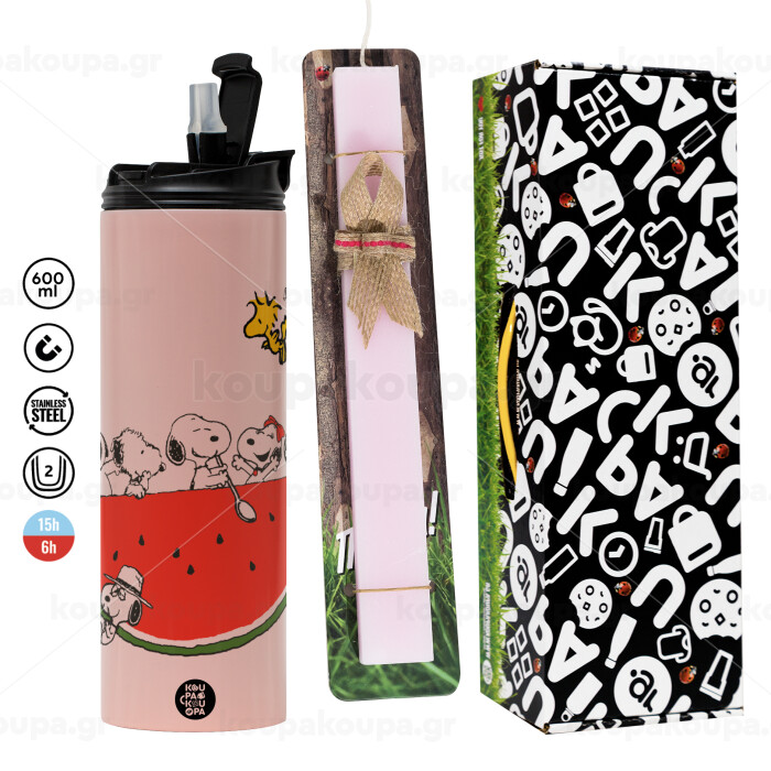 Snoopy summer, Easter candle, Travel Tumbler 600ml Double Wall & aromatic flat candle (30cm) (PINK)