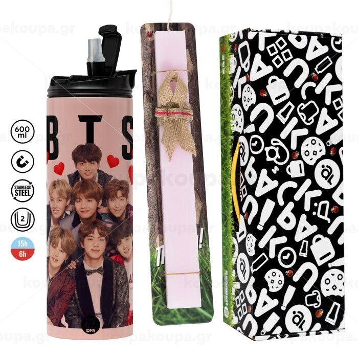 BTS hearts, Easter candle,Travel Tumbler 2 Lids, with metal straw & cleaning brush & aromatic flat candle (30cm) (PINK)