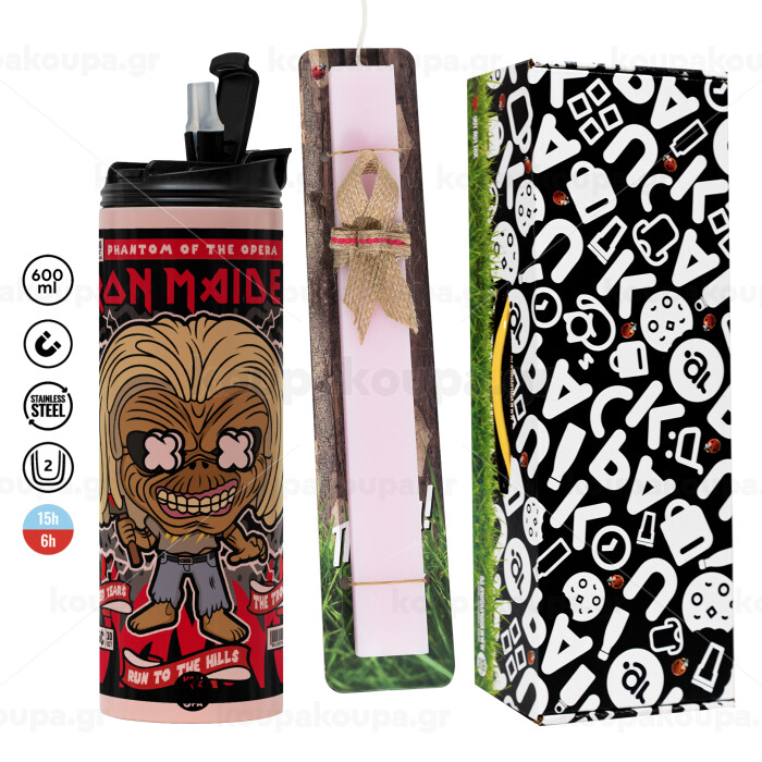 Iron maiden (eddie), Easter candle,Travel Tumbler 2 Lids, with metal straw & cleaning brush & aromatic flat candle (30cm) (PINK)