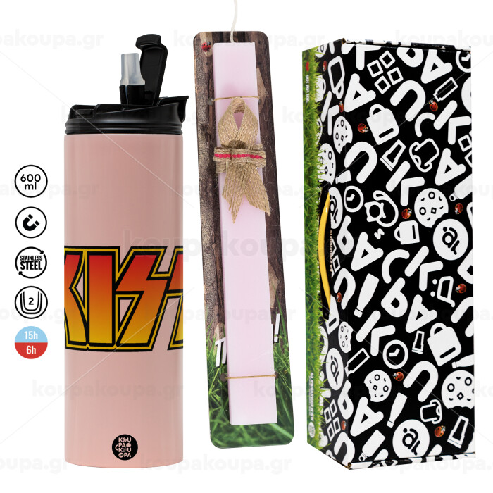 KISS, Easter candle,Travel Tumbler 2 Lids, with metal straw & cleaning brush & aromatic flat candle (30cm) (PINK)