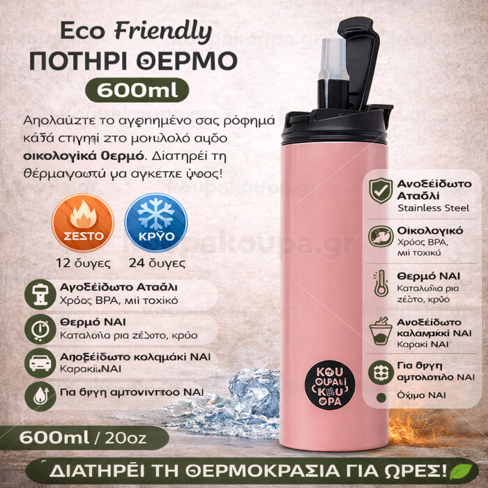 Eco friendly 600ml thermal cup with a metallic reusable straw. Enjoy your favorite beverage at any moment in this unique eco-friendly thermos. It maintains the temperature for several hours and is made from stainless steel. Suitable for both hot and cold beverages. It comes with a cleaning brush for the straw.