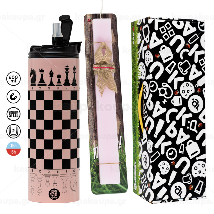 Chess, Easter candle,Travel Tumbler 2 Lids, with metal straw & cleaning brush & aromatic flat candle (30cm) (PINK)