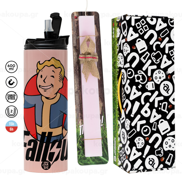 Fallout Vault Boy, Easter candle,Travel Tumbler 2 Lids, with metal straw & cleaning brush & aromatic flat candle (30cm) (PINK)