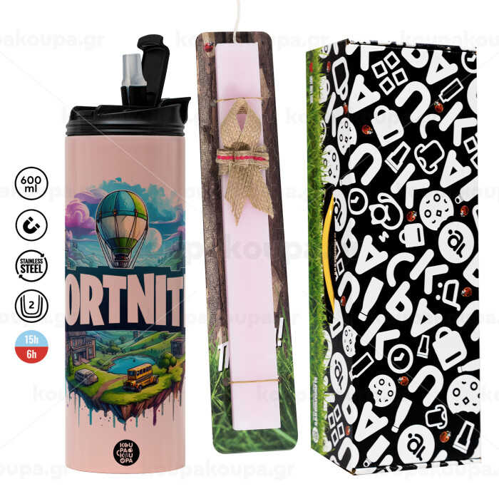 Fortnite land, Easter candle,Travel Tumbler 2 Lids, with metal straw & cleaning brush & aromatic flat candle (30cm) (PINK)