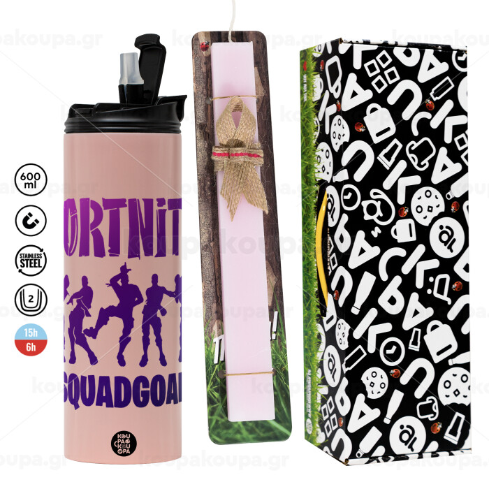 Fortnite #squadgoals, Easter candle,Travel Tumbler 2 Lids, with metal straw & cleaning brush & aromatic flat candle (30cm) (PINK)