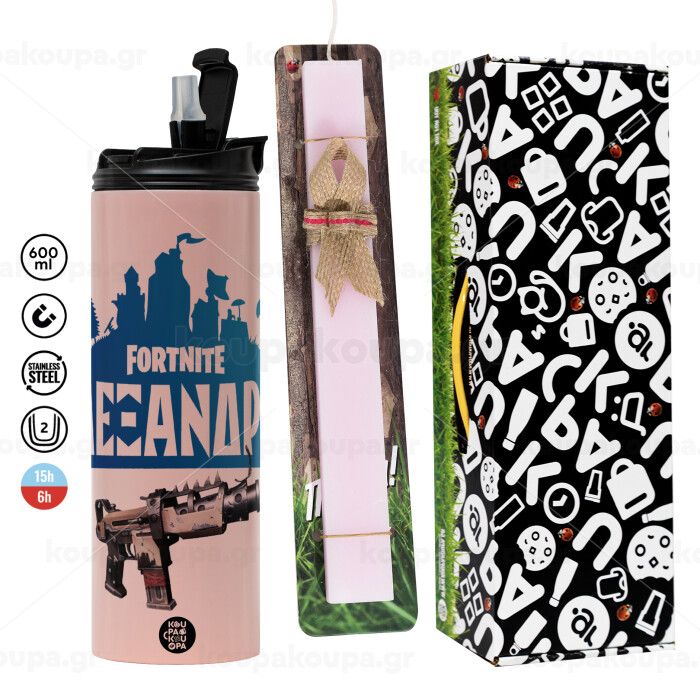 Fortnite with gun με το όνομα σου, Easter candle, Travel Tumbler 600ml Double Wall & aromatic flat candle (30cm) (PINK)