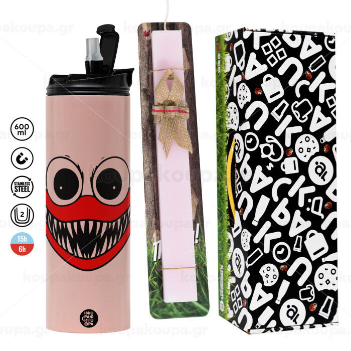 Huggy wuggy, Easter candle,Travel Tumbler 2 Lids, with metal straw & cleaning brush & aromatic flat candle (30cm) (PINK)