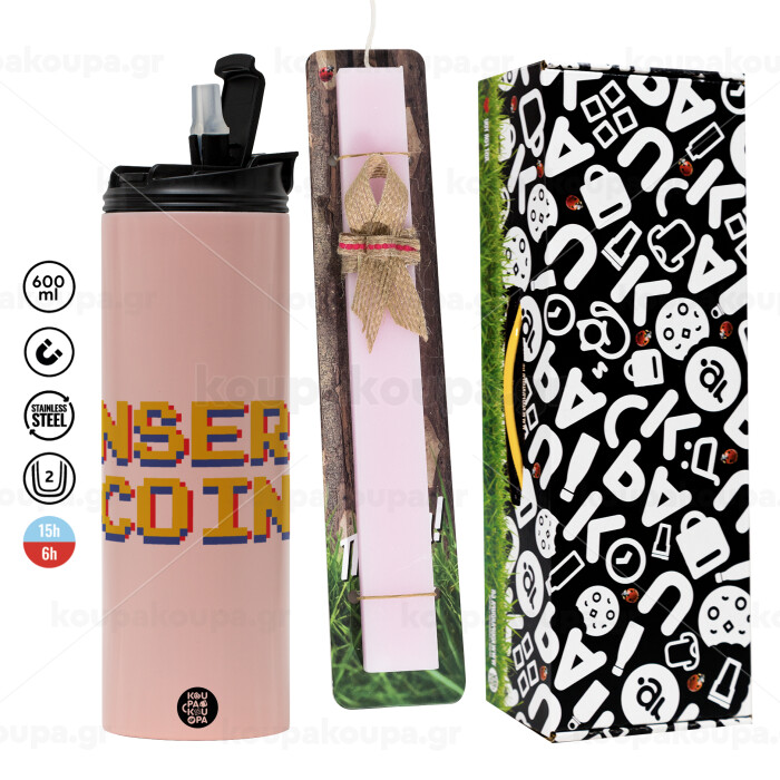Insert coin!!!, Easter candle,Travel Tumbler 2 Lids, with metal straw & cleaning brush & aromatic flat candle (30cm) (PINK)