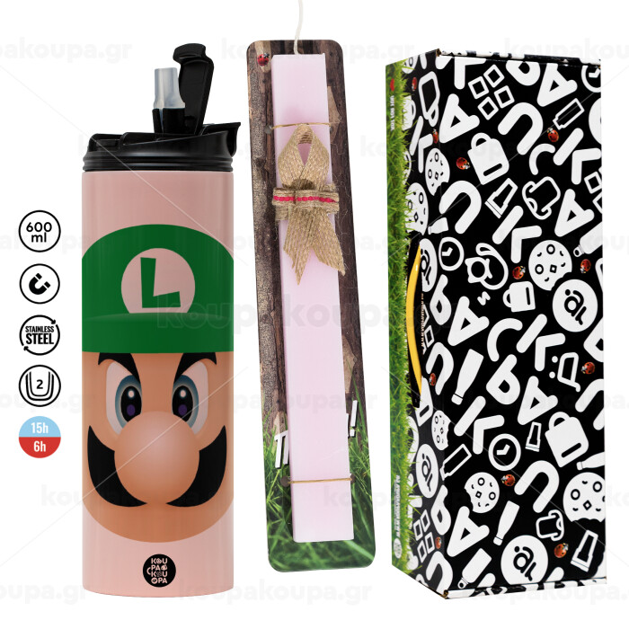Luigi flat, Easter candle,Travel Tumbler 2 Lids, with metal straw & cleaning brush & aromatic flat candle (30cm) (PINK)