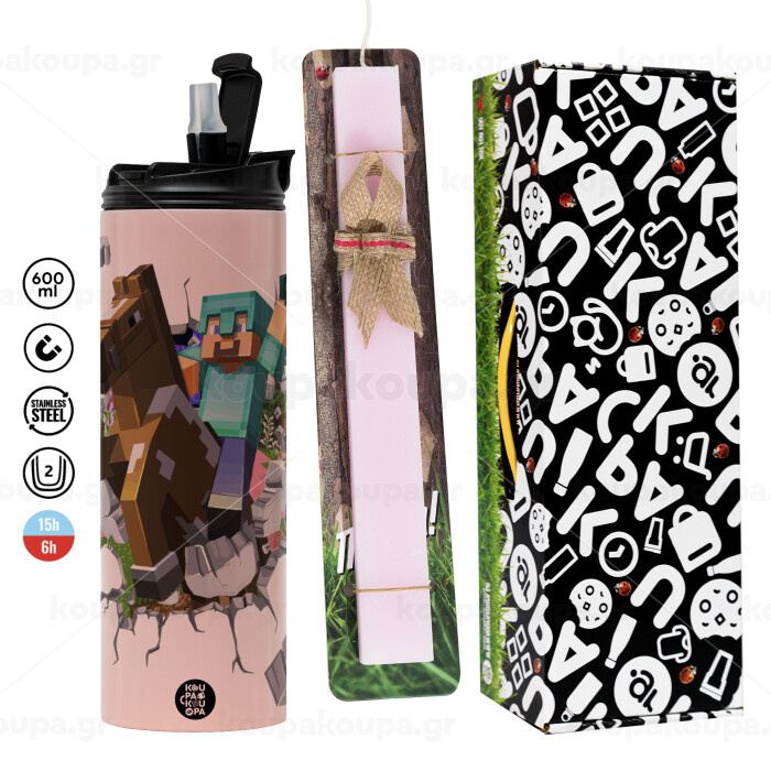 Minecraft brick, Easter candle,Travel Tumbler 2 Lids, with metal straw & cleaning brush & aromatic flat candle (30cm) (PINK)