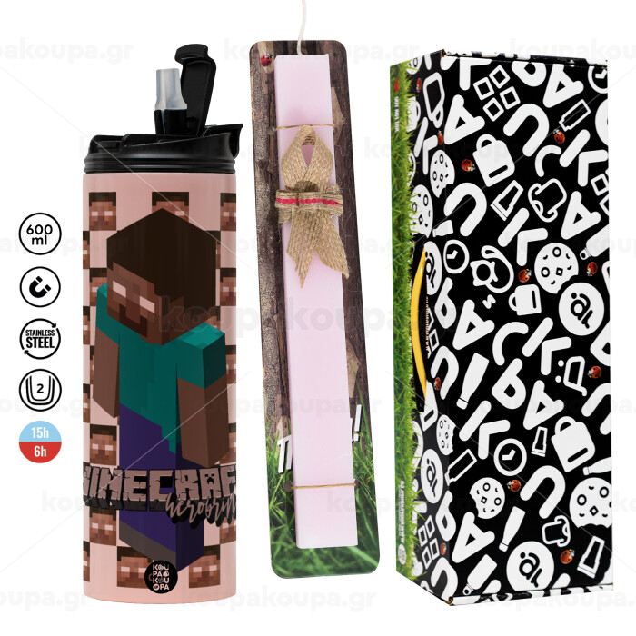 Minecraft herobrine, Easter candle,Travel Tumbler 2 Lids, with metal straw & cleaning brush & aromatic flat candle (30cm) (PINK)