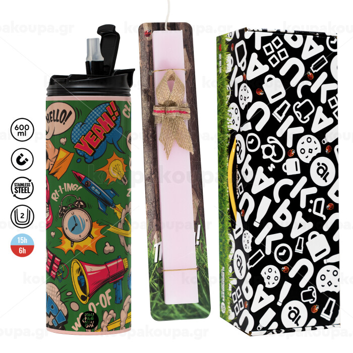 Pop art colorful seamless, Easter candle,Travel Tumbler 2 Lids, with metal straw & cleaning brush & aromatic flat candle (30cm) (PINK)