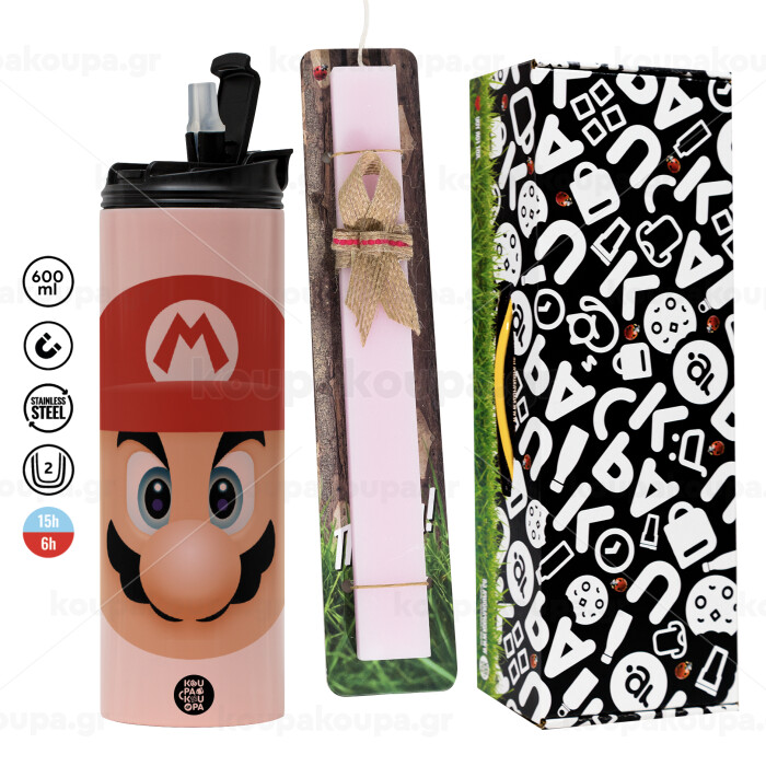 Super mario flat, Easter candle,Travel Tumbler 2 Lids, with metal straw & cleaning brush & aromatic flat candle (30cm) (PINK)