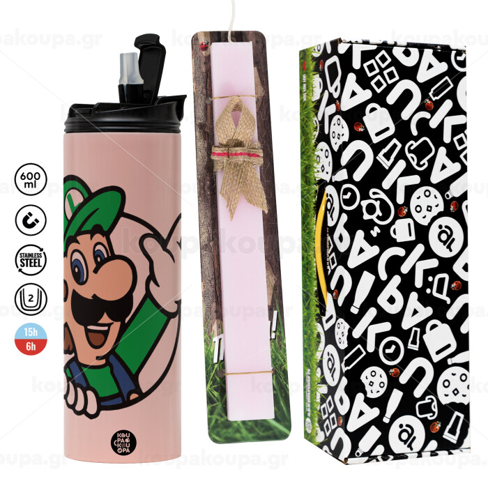 Super mario Luigi win, Easter candle,Travel Tumbler 2 Lids, with metal straw & cleaning brush & aromatic flat candle (30cm) (PINK)