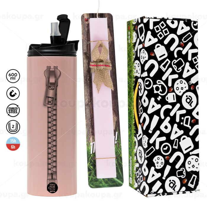 Zipper, Easter candle,Travel Tumbler 2 Lids, with metal straw & cleaning brush & aromatic flat candle (30cm) (PINK)