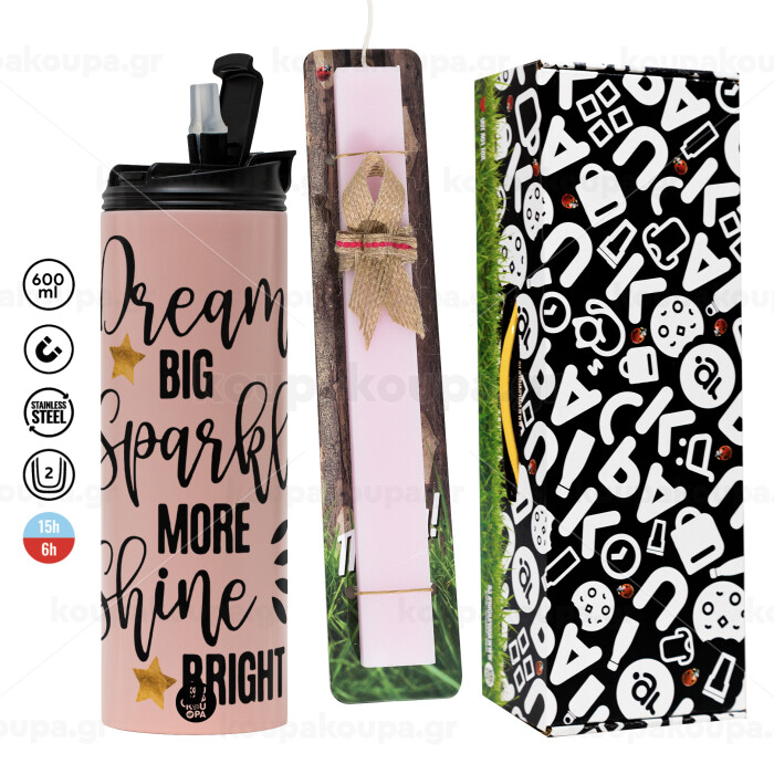 Dream big, Sparkle more, Shine bright, Easter candle,Travel Tumbler 2 Lids, with metal straw & cleaning brush & aromatic flat candle (30cm) (PINK)
