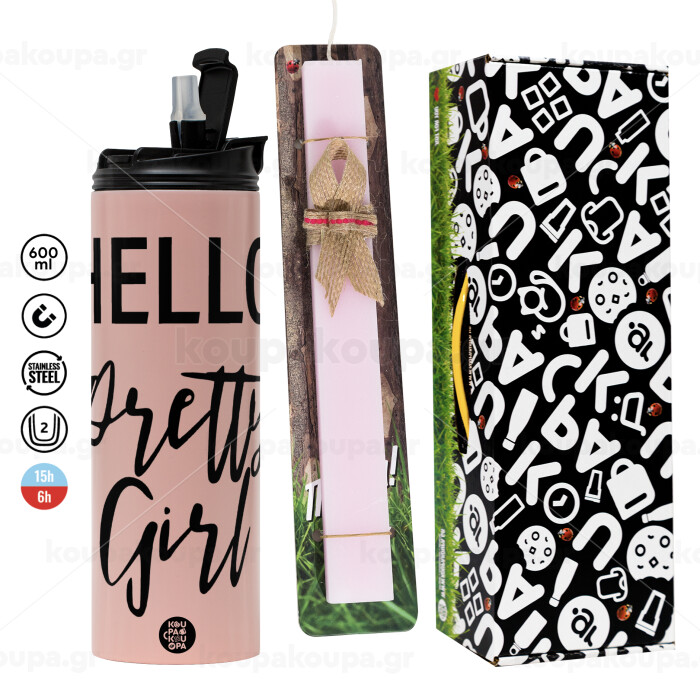 Hello pretty girl, Easter candle,Travel Tumbler 2 Lids, with metal straw & cleaning brush & aromatic flat candle (30cm) (PINK)