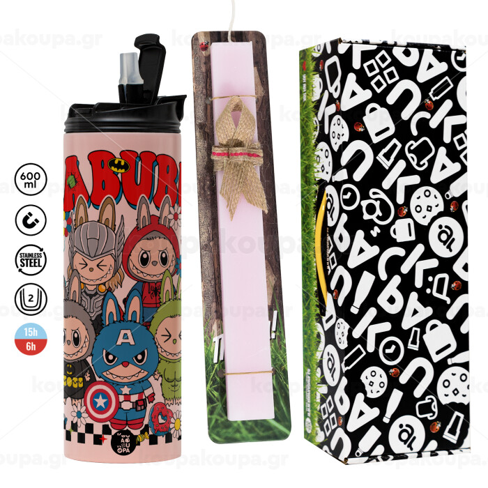 Labubu superheroes, Easter candle,Travel Tumbler 2 Lids, with metal straw & cleaning brush & aromatic flat candle (30cm) (PINK)