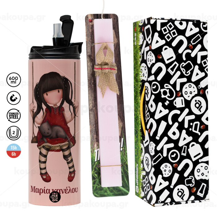 Santoro, Easter candle,Travel Tumbler 2 Lids, with metal straw & cleaning brush & aromatic flat candle (30cm) (PINK)