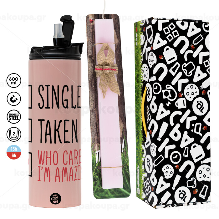 Single, Taken, Who cares i'm amazing, Easter candle,Travel Tumbler 2 Lids, with metal straw & cleaning brush & aromatic flat candle (30cm) (PINK)